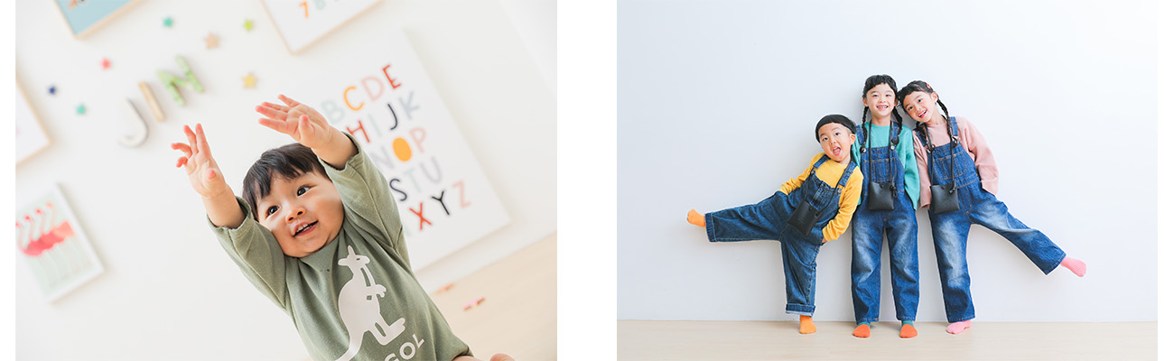 スタッフ全員が心から子どもが大好きで、同じ目線でとんだり跳ねたり笑ったり、一方で人見知りの場合は静かに見守りながらなど、お客さまに合わせたスタイルで撮影を行っています。