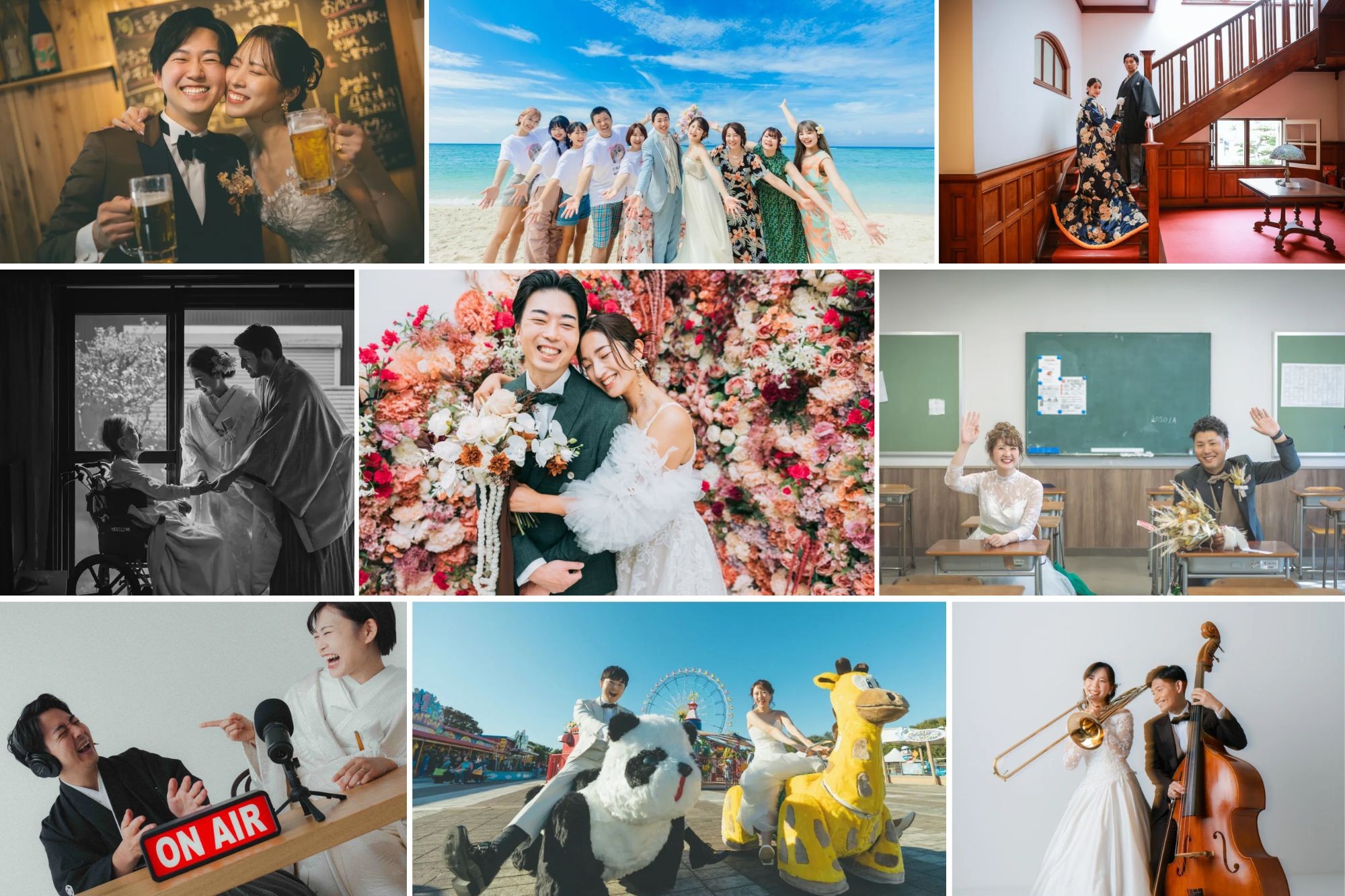 入籍から2年越しの撮影で、撮りたいパターンを全部残すことに決めたおふたり。スタジオもロケーション撮影も、和装も洋装も、さらには私服でも。笑顔いっぱい、さまざまな姿を写真に残しました。