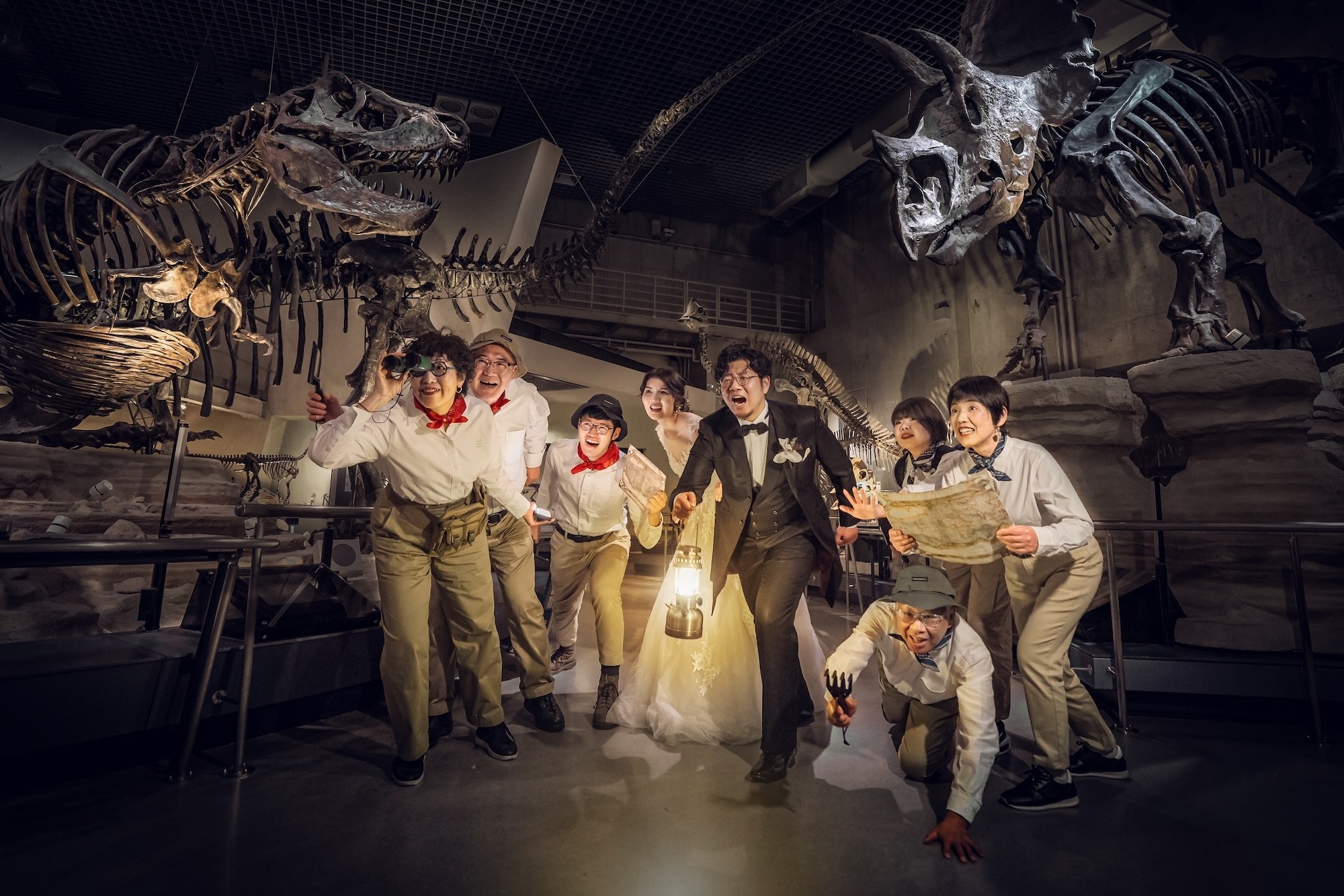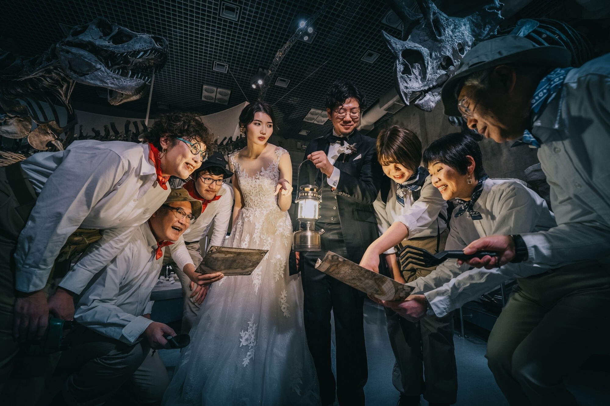 思い出の場所、国立科学博物館での撮影を希望されたおふたり。「夜のミュージアムでの宝探し」をテーマに、ご家族も衣装を揃えて参加。楽しみながら撮影に臨み、他にはない特別な一枚が完成しました。