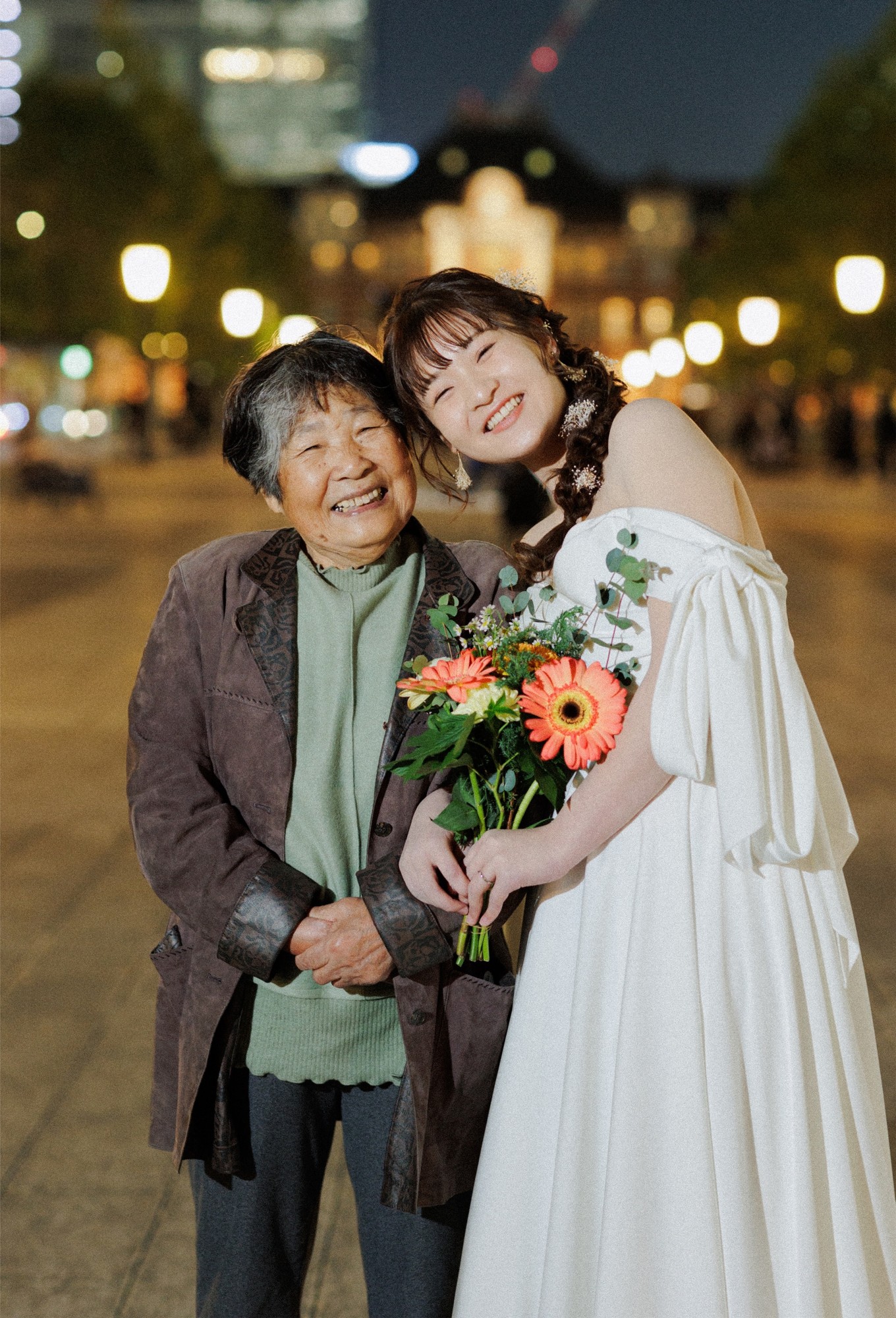 「新婦とおばあちゃんの笑顔のツーショット。『近くで見ると泣いてしまうから大丈夫』と、集合写真では遠慮してなかなか近付いてくれなかったおばあちゃん。周りの声もあって、最高の笑顔を見せてくれました。2人の物理的な距離の近さと、似ている笑顔も印象的な1枚です。」
