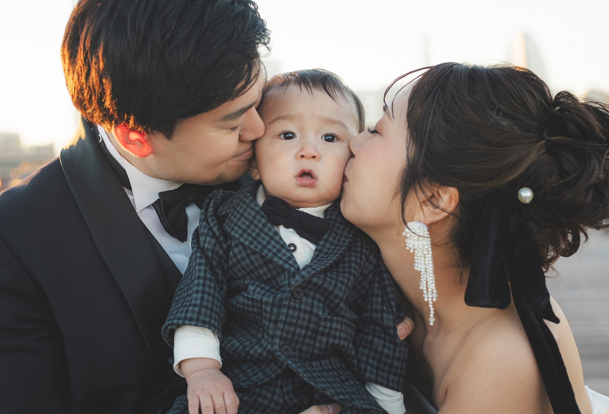 「カップルがお子さんにキスしたシーン。驚きの表情が可愛い1枚です。ピントもお子さんに合わせ、あえて背景は入れずに3人の世界観を表現しました。」