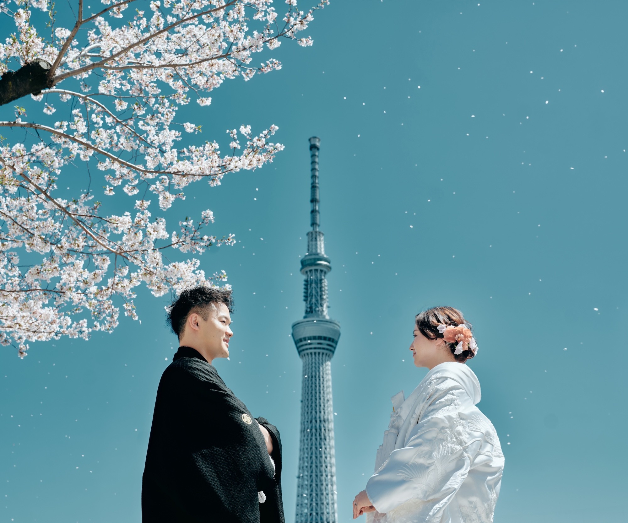 「やりたいことの明確な2人で、アーティスティックな写真を希望していました。この写真は、浅草エリアで実施したロケーションフォト。東京スカイツリーを入れて撮影しました。この日はちょうど桜の開花シーズンで、画角に収めたところ、偶然風が吹いて桜の花びらの舞う様子を収めることができました。近づきすぎると2人の雰囲気に合わないと思い、あえて少し離れた距離感もポイントの1つ。バランスの取れた構図を重視しました。もう1つのこだわりはレタッチ。画角と桜に合うよう、空の色を緑よりの青にしたのもポイントです。」