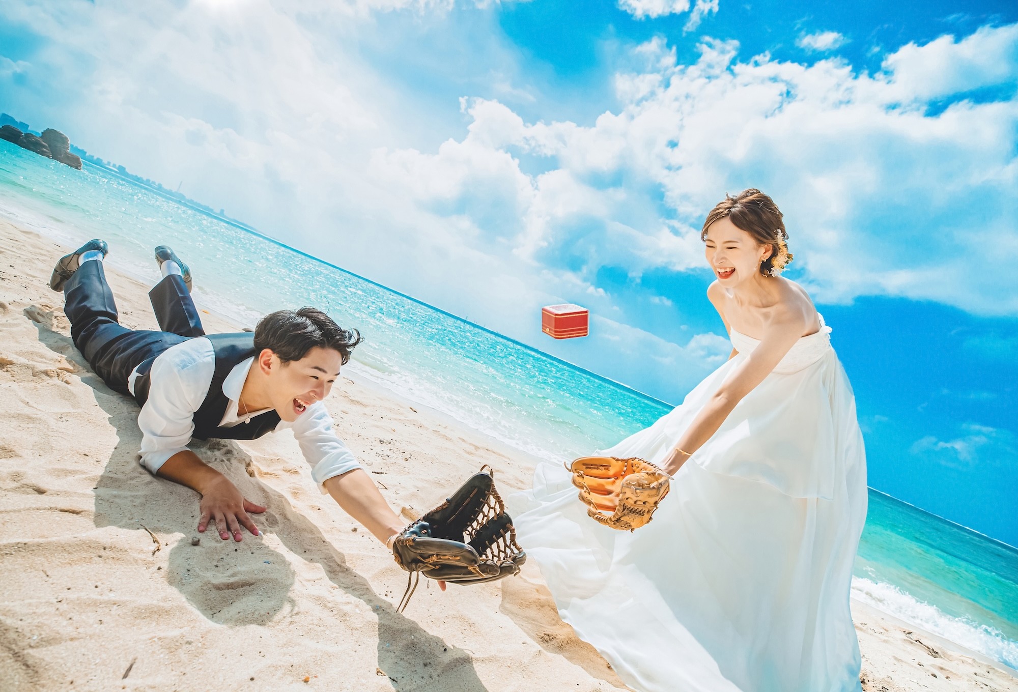 「カップルが撮影日にボールを忘れてしまい、代わりにカルティエの指輪ケースをボールに見立てたことで、宝物を2人で取りにいくような写真になりました。」