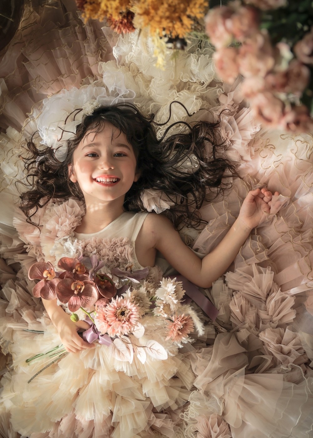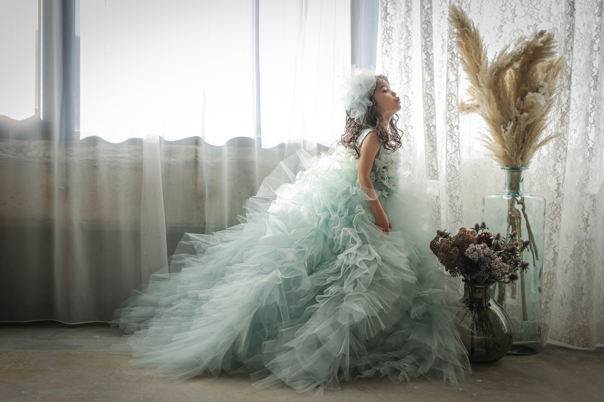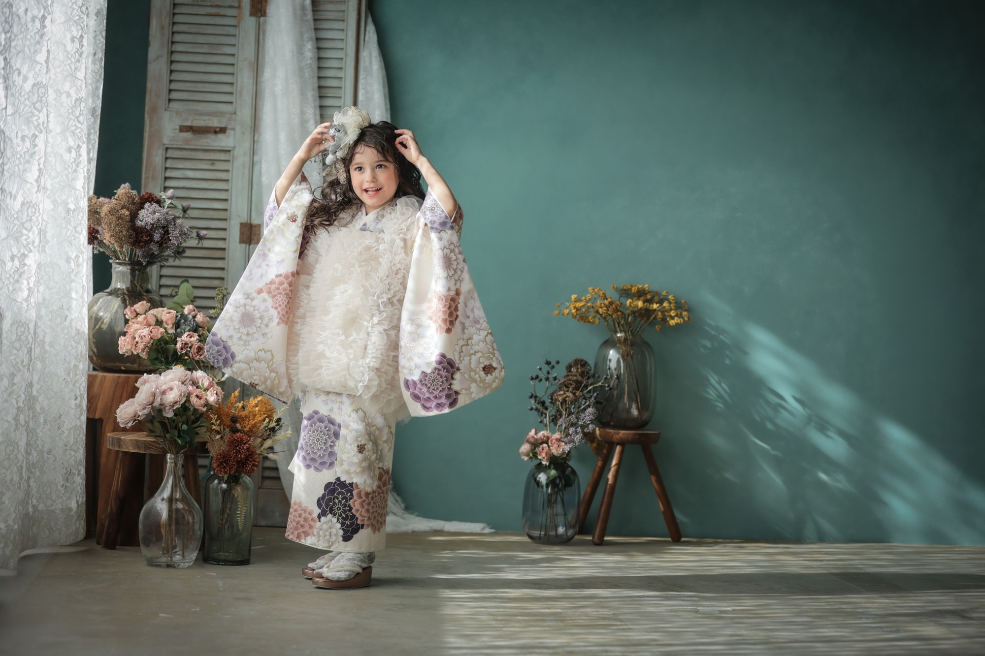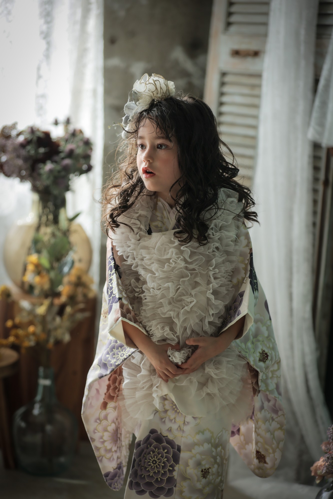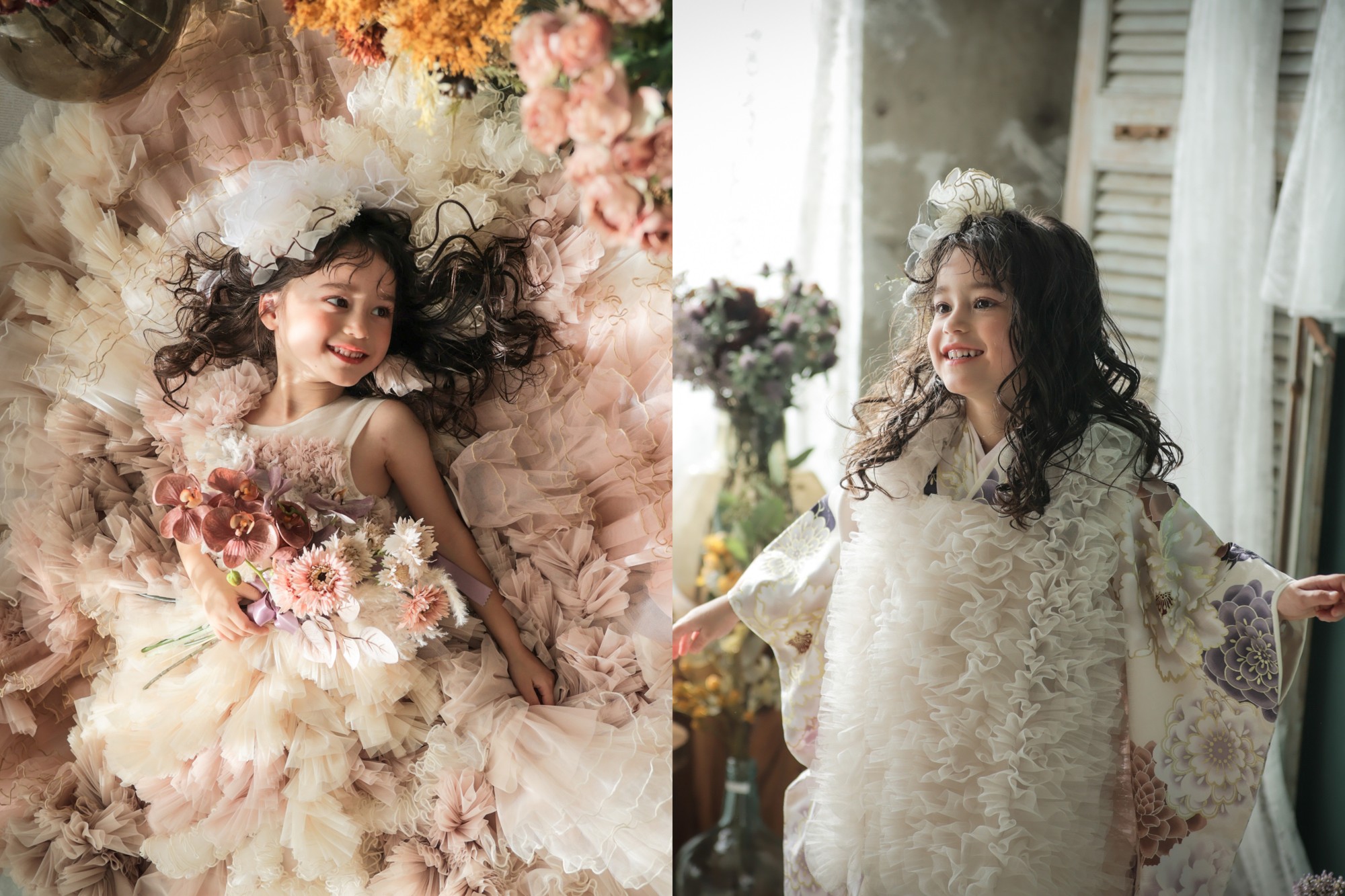 和装では希少な正絹の着物をご用意しているほか、チュールなどの小物を用い、お子さまひとりひとりにぴったりのコーディネートをご提案します。また洋装では、店舗オープンに向けてオーダーメイドしたラグジュアリードレスが入荷。細部までこだわり抜いた衣装で、特別な1枚を残せます。